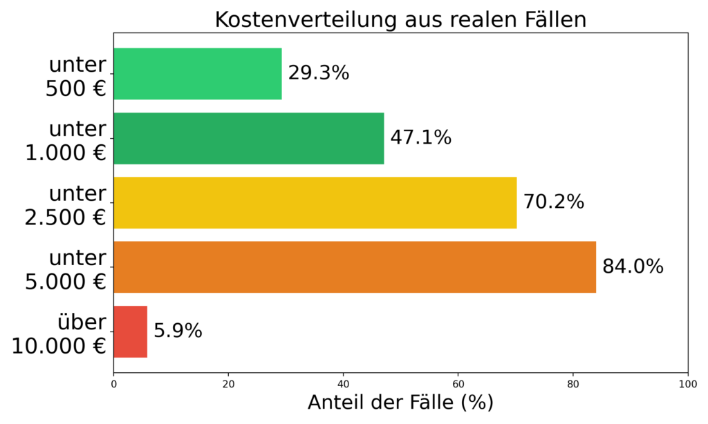 Es wird deutlich, dass 29% aller Anfragen mit weniger als 500 Euro erledigt werden konnten, 47% mit weniger als 1.000 Euro und 70% mit weniger als 2.500 Euro.
